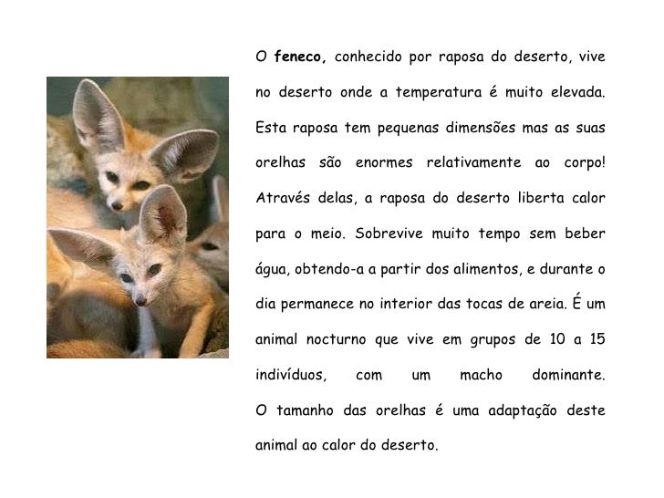 25. 25. O feneco, conhecido por raposa do deserto, vive no deserto onde a temperatura é muito elevada. Esta raposa tem pequenas dimensões mas as suas orelhas são enormes relativamente ao corpo! Através delas, a raposa do deserto liberta calor para o meio. Sobrevive muito tempo sem beber água, obtendo-a a partir dos alimentos, e durante o dia permanece no interior das tocas de areia. É um animal nocturno que vive em grupos de 10 a 15 indivíduos, com um macho dominante. O tamanho das orelhas é uma adaptação deste animal ao calor do deserto.