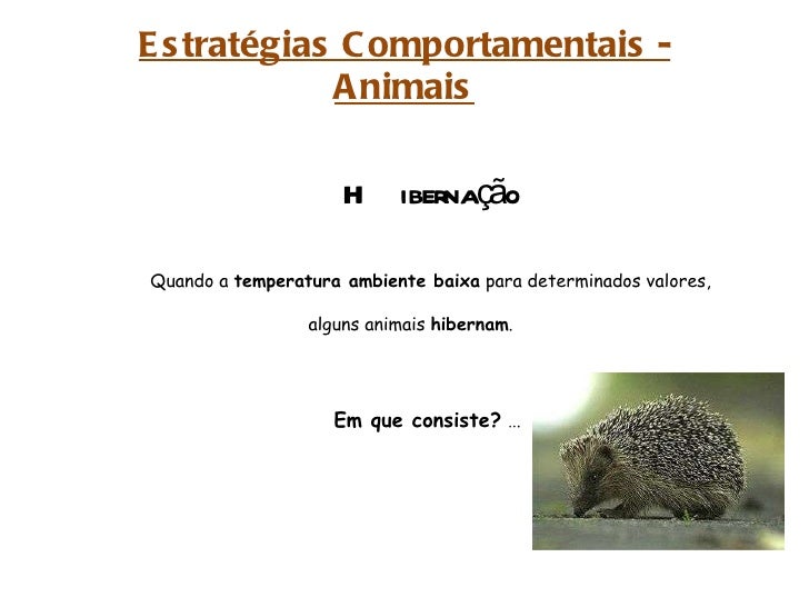 26. 26. Estratégias Comportamentais - Animais Hibernação Quando a temperatura ambiente baixa para determinados valores, alguns animais hibernam . Em que consiste? …