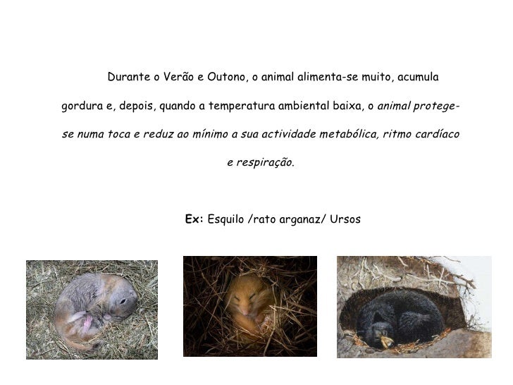 27. 27. Durante o Verão e Outono, o animal alimenta-se muito, acumula gordura e, depois, quando a temperatura ambiental baixa, o animal protege-se numa toca e reduz ao mínimo a sua actividade metabólica, ritmo cardíaco e respiração . Ex: Esquilo /rato arganaz/ Ursos