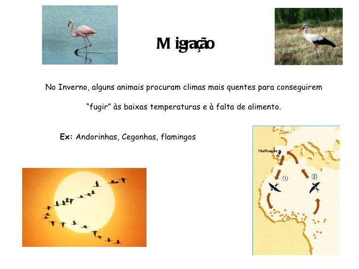 29. 29. <ul><li>Migração </li></ul><ul><li>No Inverno, alguns animais procuram climas mais quentes para conseguirem “fugir” às baixas temperaturas e à falta de alimento. </li></ul><ul><ul><li>Ex: Andorinhas, Cegonhas, flamingos </li></ul></ul>