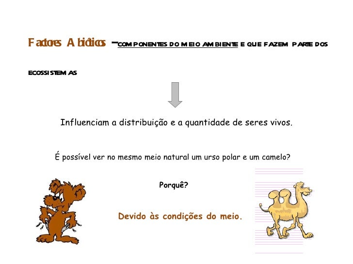 3. 3. Factores Abióticos – componentes do meio ambiente e que fazem parte dos ecossistemas Influenciam a distribuição e a quantidade de seres vivos. É possível ver no mesmo meio natural um urso polar e um camelo? Porquê? Devido às condições do meio.