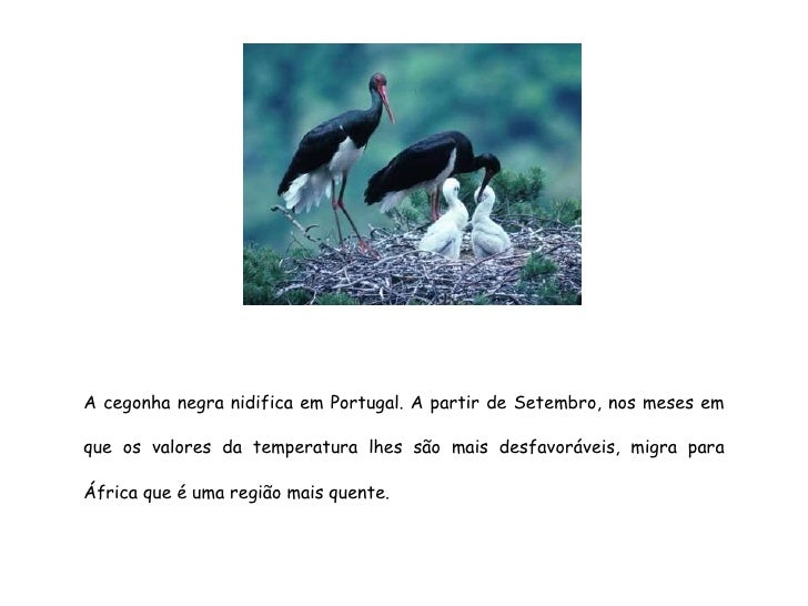 30. 30. <ul><ul><ul><ul><ul><li>A cegonha negra nidifica em Portugal. A partir de Setembro, nos meses em que os valores da temperatura lhes são mais desfavoráveis, migra para África que é uma região mais quente. </li></ul></ul></ul></ul></ul>