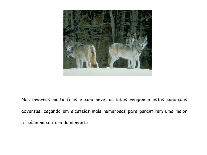 31. 31. <ul><ul><ul><ul><ul><li>Nos invernos muito frios e com neve, os lobos reagem a estas condições adversas, caçando em alcateias mais numerosas para garantirem uma maior eficácia na captura do alimento. </li></ul></ul></ul></ul></ul>