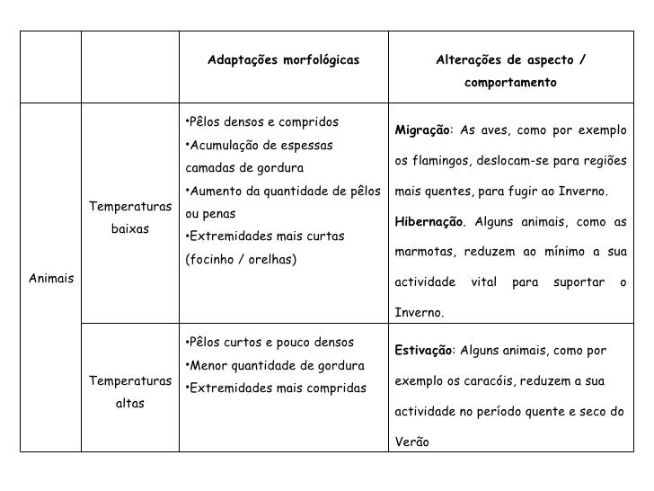 32. 32. Adaptações morfológicas Alterações de aspecto / comportamento Animais Temperaturas baixas <ul><li>Pêlos densos e compridos </li></ul><ul><li>Acumulação de espessas camadas de gordura </li></ul><ul><li>Aumento da quantidade de pêlos ou penas </li></ul><ul><li>Extremidades mais curtas (focinho / orelhas) </li></ul>Migração : As aves, como por exemplo os flamingos, deslocam-se para regiões mais quentes, para fugir ao Inverno. Hibernação . Alguns animais, como as marmotas, reduzem ao mínimo a sua actividade vital para suportar o Inverno. Temperaturas altas <ul><li>Pêlos curtos e pouco densos </li></ul><ul><li>Menor quantidade de gordura </li></ul><ul><li>Extremidades mais compridas </li></ul>Estivação : Alguns animais, como por exemplo os caracóis, reduzem a sua actividade no período quente e seco do Verão