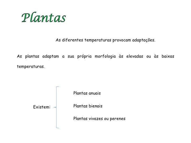 33. 33. Plantas As diferentes temperaturas provocam adaptações. As plantas adaptam a sua própria morfologia às elevadas ou às baixas temperaturas. Existem : Plantas anuais Plantas bienais Plantas vivazes ou perenes