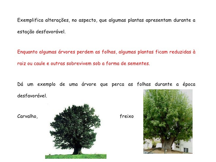 35. 35. Exemplifica alterações, no aspecto, que algumas plantas apresentam durante a estação desfavorável. Enquanto algumas árvores perdem as folhas, algumas plantas ficam reduzidas à raiz ou caule e outras sobrevivem sob a forma de sementes. Dá um exemplo de uma árvore que perca as folhas durante a época desfavorável. Carvalho, freixo