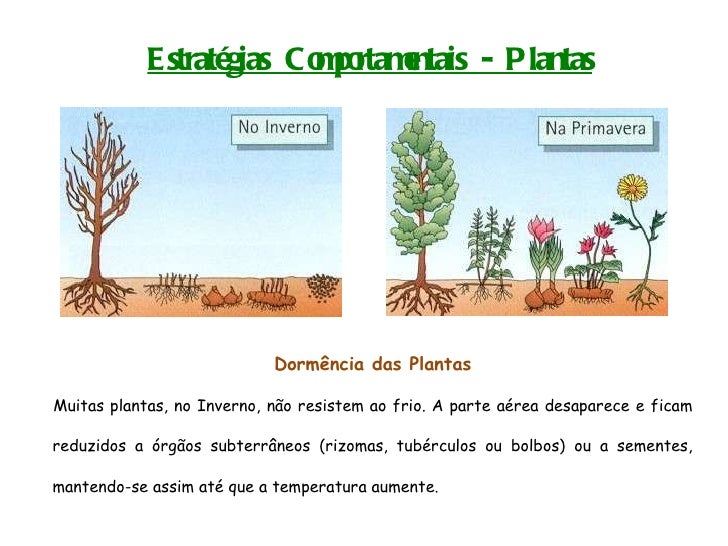 36. 36. Estratégias Comportamentais - Plantas Dormência das Plantas Muitas plantas, no Inverno, não resistem ao frio. A parte aérea desaparece e ficam reduzidos a órgãos subterrâneos (rizomas, tubérculos ou bolbos) ou a sementes, mantendo-se assim até que a temperatura aumente.
