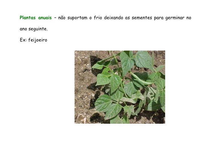 37. 37. Plantas anuais – não suportam o frio deixando as sementes para germinar no ano seguinte. Ex: feijoeiro