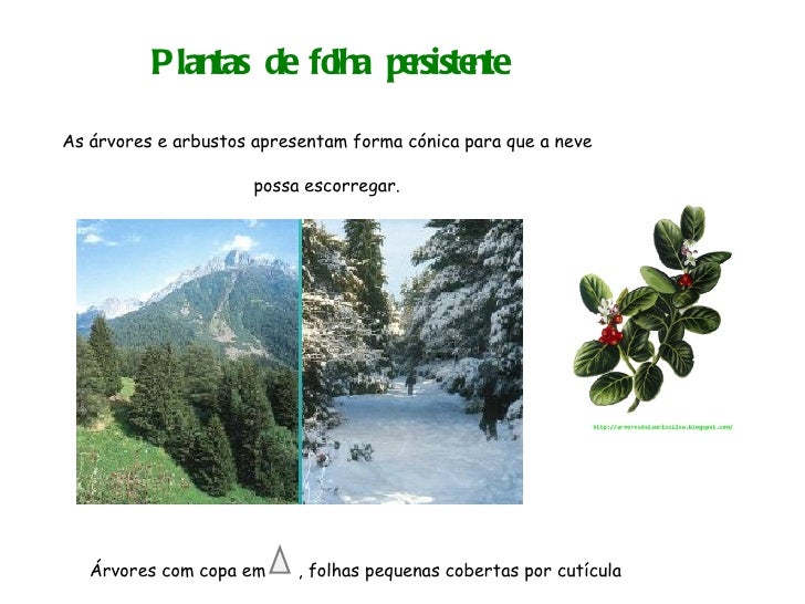 41. 41. Plantas de folha persistente As árvores e arbustos apresentam forma cónica para que a neve possa escorregar. Árvores com copa em , folhas pequenas cobertas por cutícula