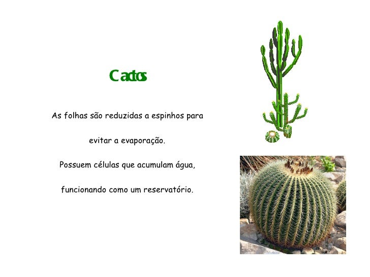 43. 43. Cactos As folhas são reduzidas a espinhos para evitar a evaporação. Possuem células que acumulam água, funcionando como um reservatório.