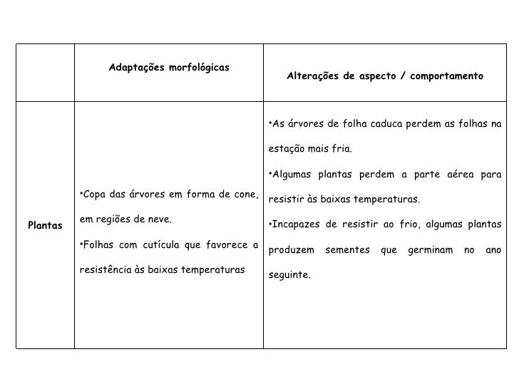 44. 44. Adaptações morfológicas Alterações de aspecto / comportamento Plantas <ul><li>Copa das árvores em forma de cone, em regiões de neve. </li></ul><ul><li>Folhas com cutícula que favorece a resistência às baixas temperaturas </li></ul><ul><li>As árvores de folha caduca perdem as folhas na estação mais fria. </li></ul><ul><li>Algumas plantas perdem a parte aérea para resistir às baixas temperaturas. </li></ul><ul><li>Incapazes de resistir ao frio, algumas plantas produzem sementes que germinam no ano seguinte. </li></ul>
