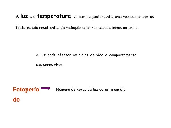 46. 46. A luz e a temperatura variam conjuntamente, uma vez que ambos os factores são resultantes da radiação solar nos ecossistemas naturais. A luz pode afectar os ciclos de vida e comportamento dos seres vivos Fotoperíodo Número de horas de luz durante um dia