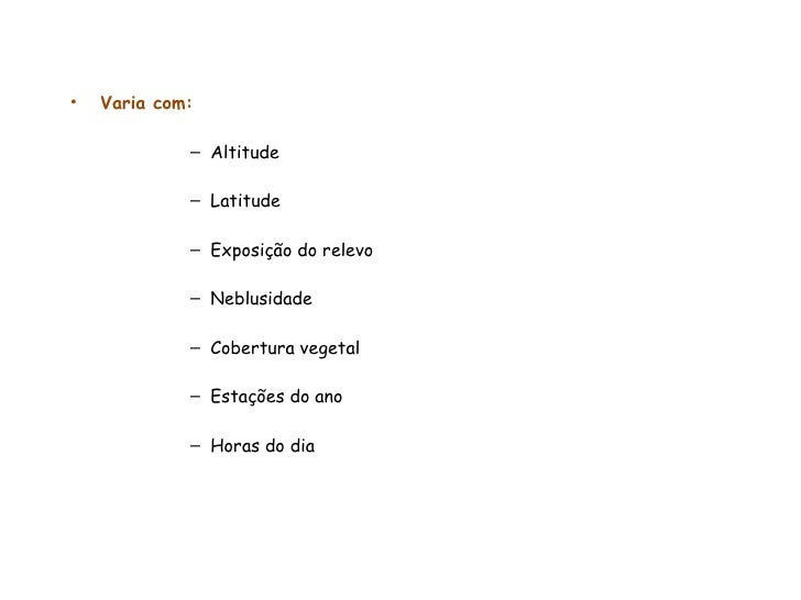 47. 47. <ul><li>Varia com: </li></ul><ul><ul><ul><ul><li>Altitude </li></ul></ul></ul></ul><ul><ul><ul><ul><li>Latitude </li></ul></ul></ul></ul><ul><ul><ul><ul><li>Exposição do relevo </li></ul></ul></ul></ul><ul><ul><ul><ul><li>Neblusidade </li></ul></ul></ul></ul><ul><ul><ul><ul><li>Cobertura vegetal </li></ul></ul></ul></ul><ul><ul><ul><ul><li>Estações do ano </li></ul></ul></ul></ul><ul><ul><ul><ul><li>Horas do dia </li></ul></ul></ul></ul>