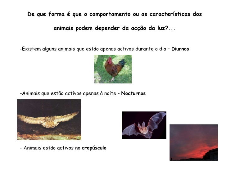 49. 49. <ul><li>Existem alguns animais que estão apenas activos durante o dia – Diurnos </li></ul><ul><li>Animais que estão activos apenas à noite – Nocturnos </li></ul><ul><li>- Animais estão activos no crepúsculo </li></ul>De que forma é que o comportamento ou as características dos animais podem depender da acção da luz?...