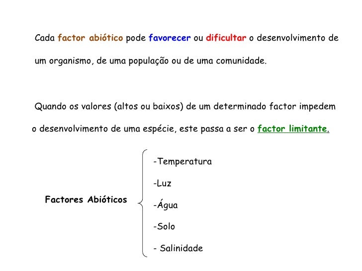 5. 5. Cada factor abiótico pode favorecer ou dificultar o desenvolvimento de um organismo, de uma população ou de uma comunidade. Factores Abióticos <ul><li>Temperatura </li></ul><ul><li>Luz </li></ul><ul><li>Água </li></ul><ul><li>Solo </li></ul><ul><li>Salinidade </li></ul>Quando os valores (altos ou baixos) de um determinado factor impedem o desenvolvimento de uma espécie, este passa a ser o factor limitante .