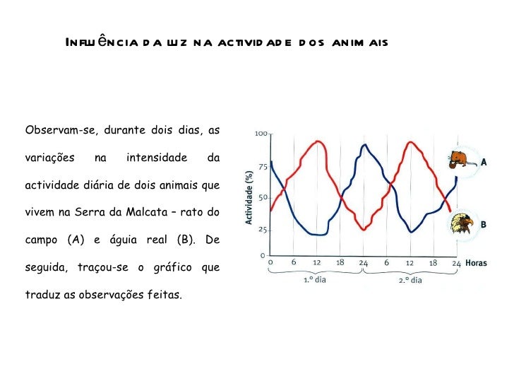 50. 50. Influência da luz na actividade dos animais Observam-se, durante dois dias, as variações na intensidade da actividade diária de dois animais que vivem na Serra da Malcata – rato do campo (A) e águia real (B). De seguida, traçou-se o gráfico que traduz as observações feitas.