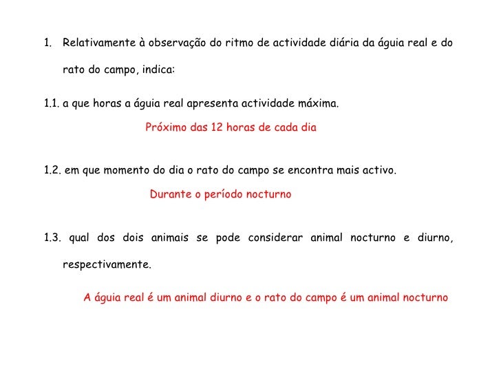 51. 51. <ul><li>Relativamente à observação do ritmo de actividade diária da águia real e do rato do campo, indica: </li></ul><ul><li>1.1. a que horas a águia real apresenta actividade máxima. </li></ul><ul><li>1.2. em que momento do dia o rato do campo se encontra mais activo. </li></ul><ul><li>1.3. qual dos dois animais se pode considerar animal nocturno e diurno, respectivamente. </li></ul>Próximo das 12 horas de cada dia Durante o período nocturno A águia real é um animal diurno e o rato do campo é um animal nocturno