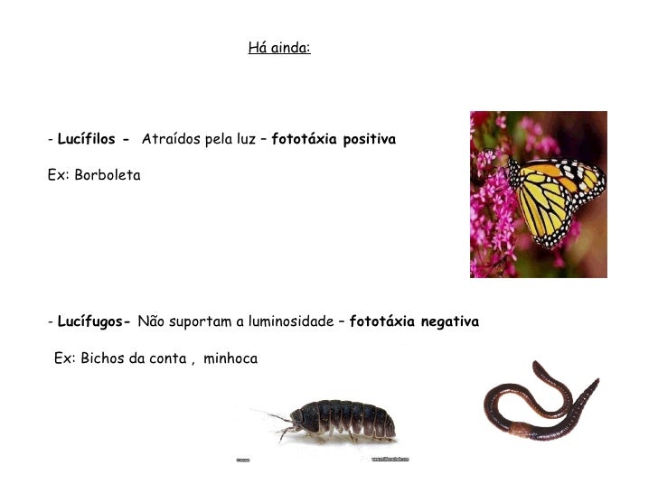 52. 52. - Lucífilos - Atraídos pela luz – fototáxia positiva Ex: Borboleta - Lucífugos- Não suportam a luminosidade – fototáxia negativa Ex: Bichos da conta , minhoca Há ainda: