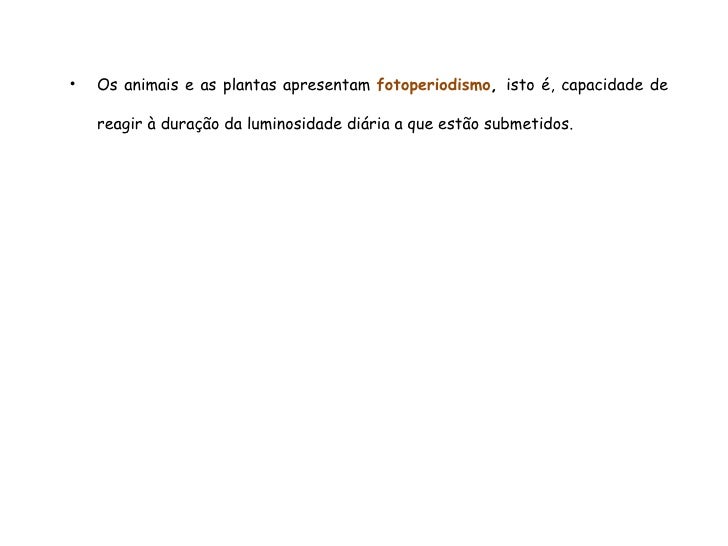 54. 54. <ul><li>Os animais e as plantas apresentam fotoperiodismo , isto é, capacidade de reagir à duração da luminosidade diária a que estão submetidos. </li></ul>