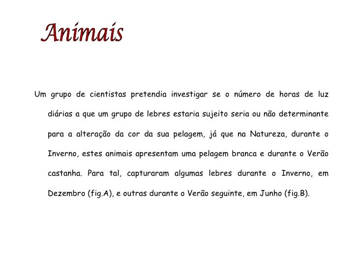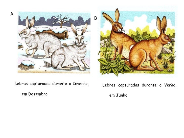 55. 55. Animais Um grupo de cientistas pretendia investigar se o número de horas de luz diárias a que um grupo de lebres estaria sujeito seria ou não determinante para a alteração da cor da sua pelagem, já que na Natureza, durante o Inverno, estes animais apresentam uma pelagem branca e durante o Verão castanha. Para tal, capturaram algumas lebres durante o Inverno, em Dezembro (fig.A), e outras durante o Verão seguinte, em Junho (fig.B).