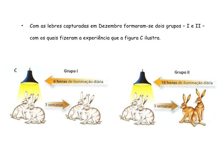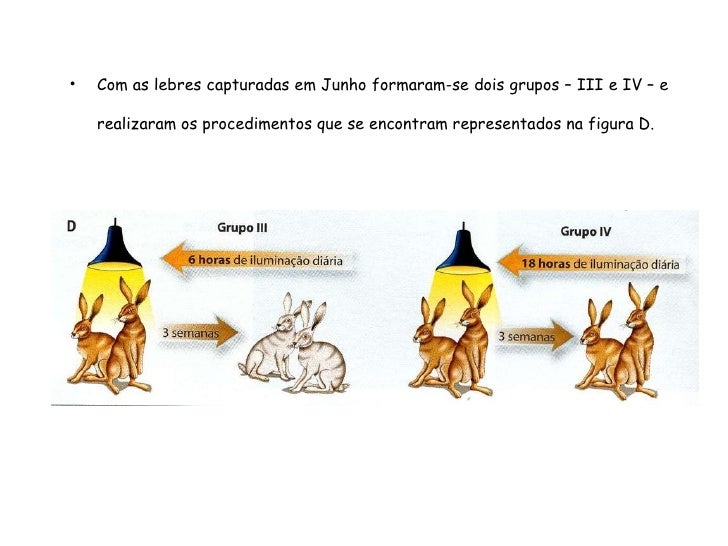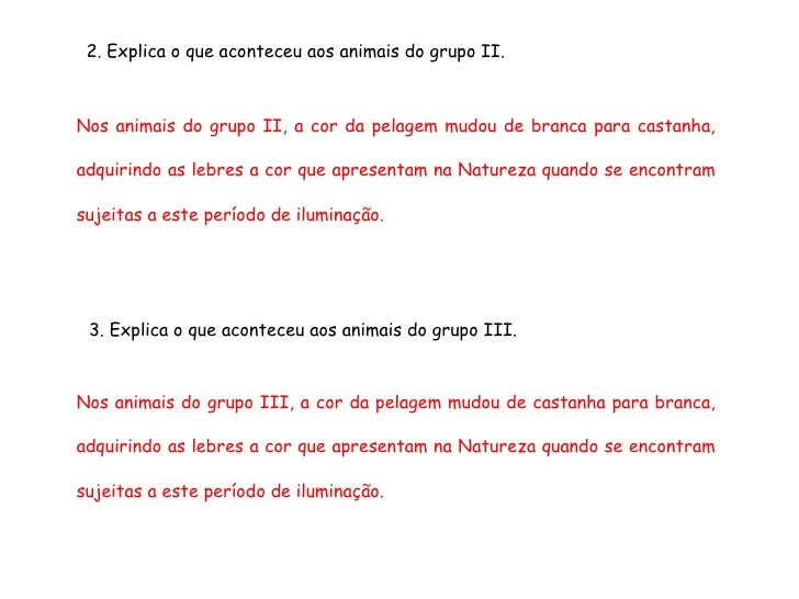 61. 61. 2. Explica o que aconteceu aos animais do grupo II. Nos animais do grupo II, a cor da pelagem mudou de branca para castanha, adquirindo as lebres a cor que apresentam na Natureza quando se encontram sujeitas a este período de iluminação. 3. Explica o que aconteceu aos animais do grupo III. Nos animais do grupo III, a cor da pelagem mudou de castanha para branca, adquirindo as lebres a cor que apresentam na Natureza quando se encontram sujeitas a este período de iluminação.