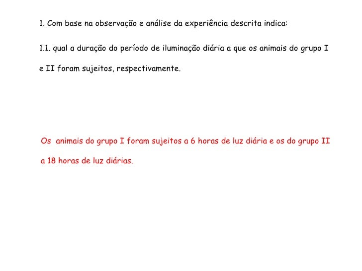 59. 59. 1. Com base na observação e análise da experiência descrita indica: 1.1. qual a duração do período de iluminação diária a que os animais do grupo I e II foram sujeitos, respectivamente. Os animais do grupo I foram sujeitos a 6 horas de luz diária e os do grupo II a 18 horas de luz diárias.