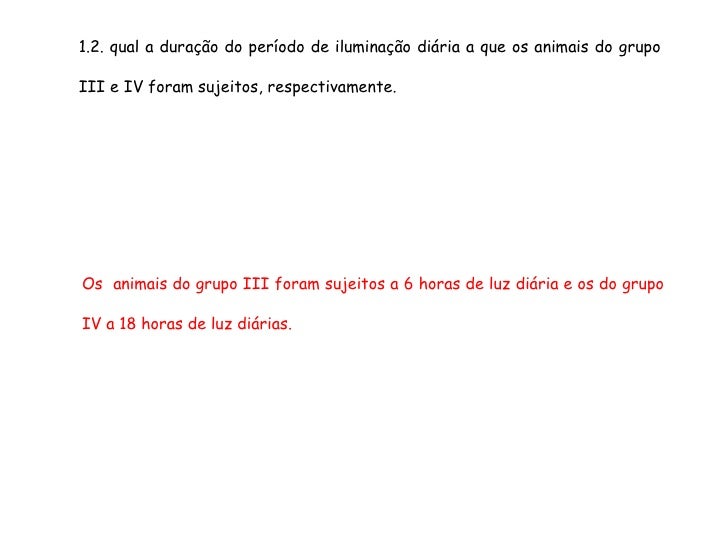60. 60. 1.2. qual a duração do período de iluminação diária a que os animais do grupo III e IV foram sujeitos, respectivamente. Os animais do grupo III foram sujeitos a 6 horas de luz diária e os do grupo IV a 18 horas de luz diárias.