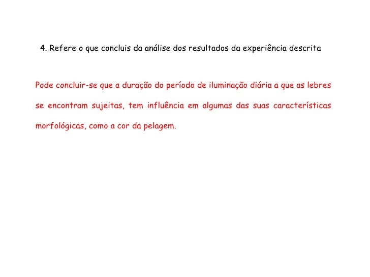 62. 62. 4. Refere o que concluis da análise dos resultados da experiência descrita Pode concluir-se que a duração do período de iluminação diária a que as lebres se encontram sujeitas, tem influência em algumas das suas características morfológicas, como a cor da pelagem.