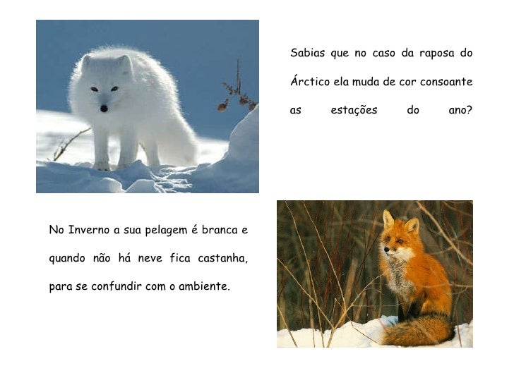 64. 64. Sabias que no caso da raposa do Árctico ela muda de cor consoante as estações do ano? No Inverno a sua pelagem é branca e quando não há neve fica castanha, para se confundir com o ambiente.