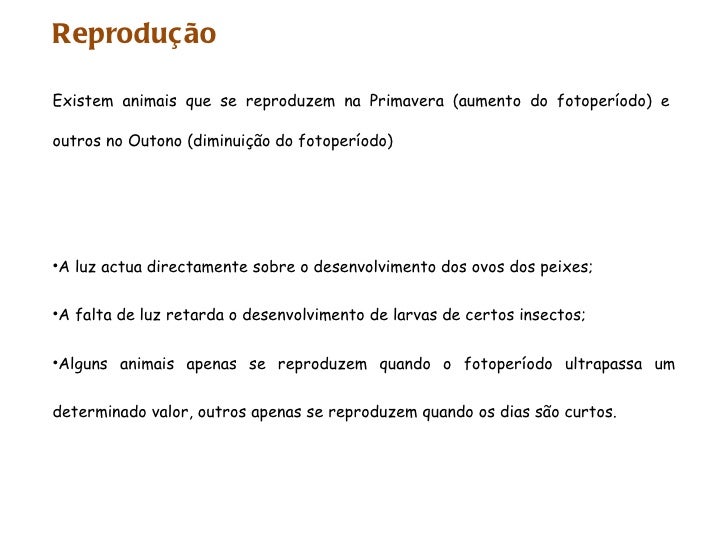 65. 65. Reprodução Existem animais que se reproduzem na Primavera (aumento do fotoperíodo) e outros no Outono (diminuição do fotoperíodo) <ul><li>A luz actua directamente sobre o desenvolvimento dos ovos dos peixes; </li></ul><ul><li>A falta de luz retarda o desenvolvimento de larvas de certos insectos; </li></ul><ul><li>Alguns animais apenas se reproduzem quando o fotoperíodo ultrapassa um determinado valor, outros apenas se reproduzem quando os dias são curtos. </li></ul>