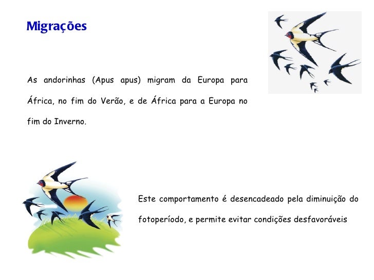 66. 66. Migrações As andorinhas (Apus apus) migram da Europa para África, no fim do Verão, e de África para a Europa no fim do Inverno. Este comportamento é desencadeado pela diminuição do fotoperíodo, e permite evitar condições desfavoráveis