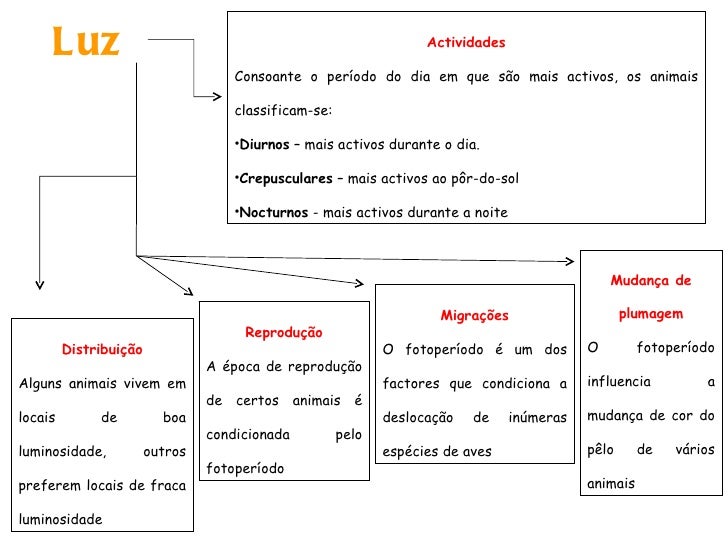 67. 67. Luz <ul><li>Actividades </li></ul><ul><li>Consoante o período do dia em que são mais activos, os animais classificam-se: </li></ul><ul><li>Diurnos – mais activos durante o dia. </li></ul><ul><li>Crepusculares – mais activos ao pôr-do-sol </li></ul><ul><li>Nocturnos - mais activos durante a noite </li></ul>Distribuição Alguns animais vivem em locais de boa luminosidade, outros preferem locais de fraca luminosidade Reprodução A época de reprodução de certos animais é condicionada pelo fotoperíodo Migrações O fotoperíodo é um dos factores que condiciona a deslocação de inúmeras espécies de aves Mudança de plumagem O fotoperíodo influencia a mudança de cor do pêlo de vários animais