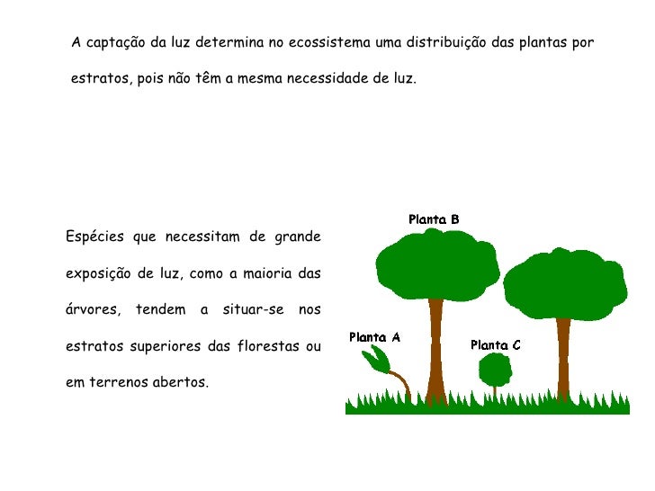 69. 69. A captação da luz determina no ecossistema uma distribuição das plantas por estratos, pois não têm a mesma necessidade de luz. Espécies que necessitam de grande exposição de luz, como a maioria das árvores, tendem a situar-se nos estratos superiores das florestas ou em terrenos abertos.