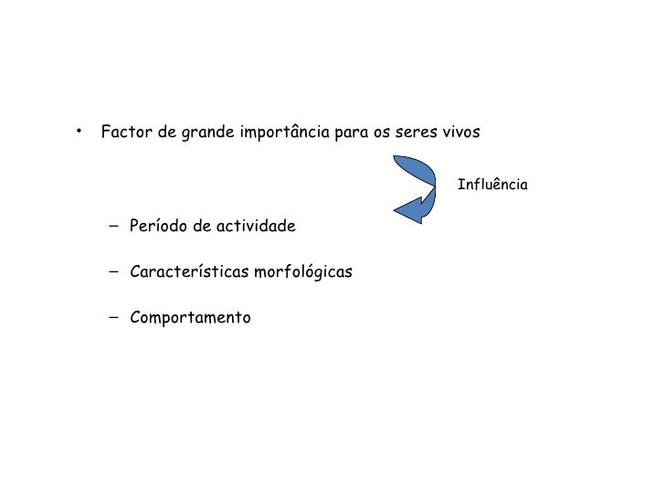 7. 7. <ul><li>Factor de grande importância para os seres vivos </li></ul><ul><ul><li>Período de actividade </li></ul></ul><ul><ul><li>Características morfológicas </li></ul></ul><ul><ul><li>Comportamento </li></ul></ul>Influência