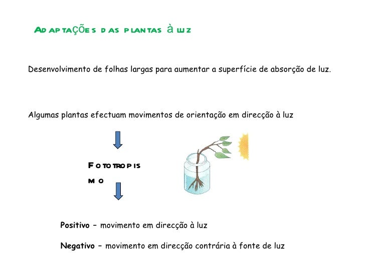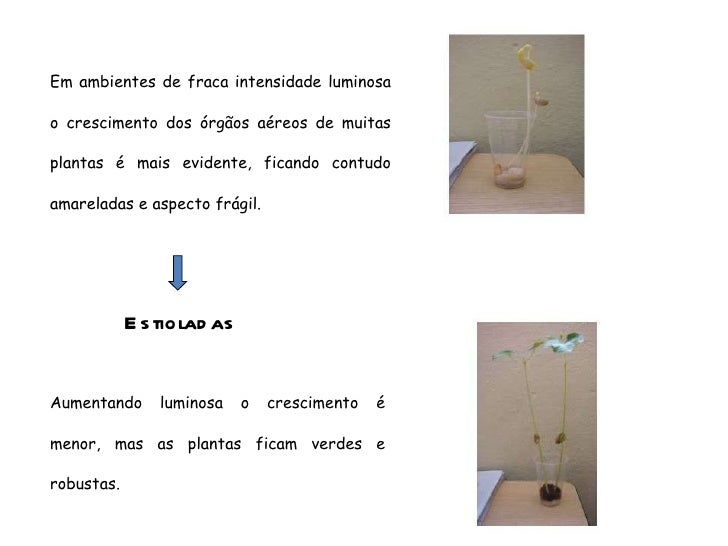 71. 71. Em ambientes de fraca intensidade luminosa o crescimento dos órgãos aéreos de muitas plantas é mais evidente, ficando contudo amareladas e aspecto frágil. Estioladas Aumentando luminosa o crescimento é menor, mas as plantas ficam verdes e robustas.