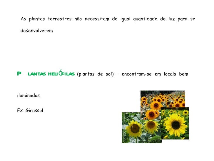 72. 72. Plantas heliófilas (plantas de sol) – encontram-se em locais bem iluminados. Ex. Girassol As plantas terrestres não necessitam de igual quantidade de luz para se desenvolverem