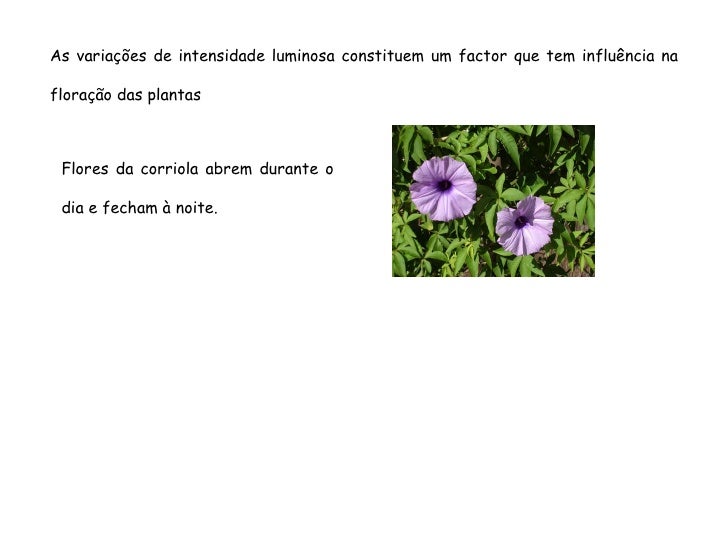 76. 76. As variações de intensidade luminosa constituem um factor que tem influência na floração das plantas Flores da corriola abrem durante o dia e fecham à noite.