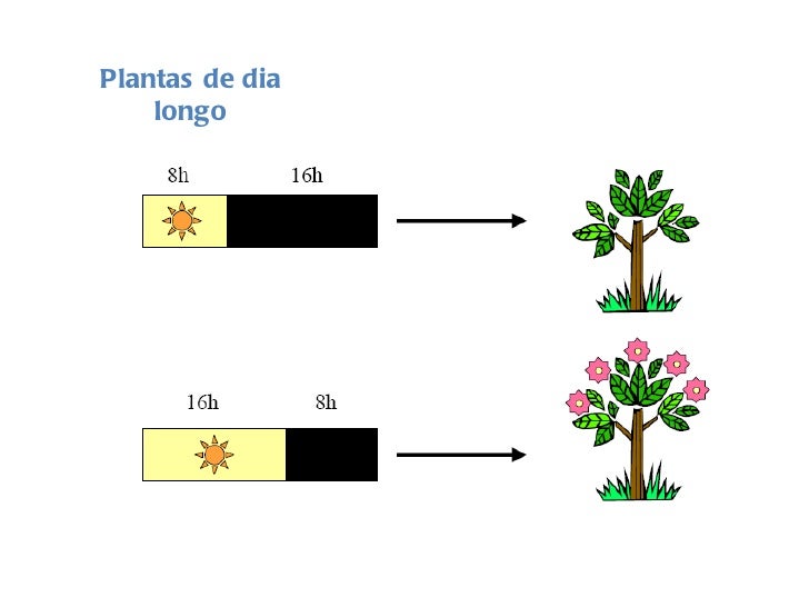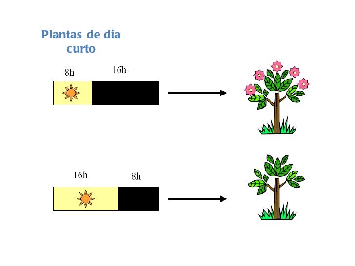 77. 77. Plantas que florescem quando o período de luz é menor que o período nocturno. Plantas de dia curto Plantas que florescem quando o fotoperíodo é curto (inferior a 8 horas).