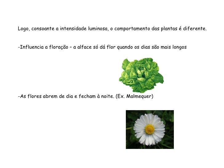 82. 82. <ul><li>Logo, consoante a intensidade luminosa, o comportamento das plantas é diferente. </li></ul><ul><li>Influencia a floração – a alface só dá flor quando os dias são mais longos </li></ul><ul><li>As flores abrem de dia e fecham à noite. (Ex. Malmequer) </li></ul>