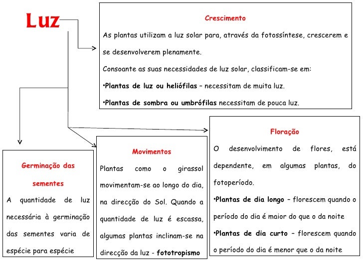83. 83. Luz <ul><li>Crescimento </li></ul><ul><li>As plantas utilizam a luz solar para, através da fotossíntese, crescerem e se desenvolverem plenamente. </li></ul><ul><li>Consoante as suas necessidades de luz solar, classificam-se em: </li></ul><ul><li>Plantas de luz ou heliófilas – necessitam de muita luz. </li></ul><ul><li>Plantas de sombra ou umbrófilas necessitam de pouca luz. </li></ul>Germinação das sementes A quantidade de luz necessária à germinação das sementes varia de espécie para espécie Movimentos Plantas como o girassol movimentam-se ao longo do dia, na direcção do Sol. Quando a quantidade de luz é escassa, algumas plantas inclinam-se na direcção da luz - fototropismo <ul><li>Floração </li></ul><ul><li>O desenvolvimento de flores, está dependente, em algumas plantas, do fotoperíodo. </li></ul><ul><li>Plantas de dia longo – florescem quando o período do dia é maior do que o da noite </li></ul><ul><li>Plantas de dia curto – florescem quando o período do dia é menor que o da noite </li></ul>