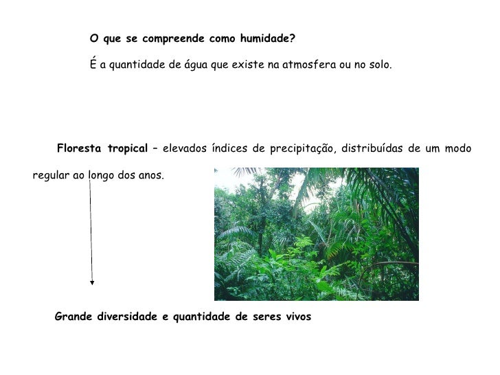 85. 85. O que se compreende como humidade? É a quantidade de água que existe na atmosfera ou no solo. Floresta tropical – elevados índices de precipitação, distribuídas de um modo regular ao longo dos anos. Grande diversidade e quantidade de seres vivos