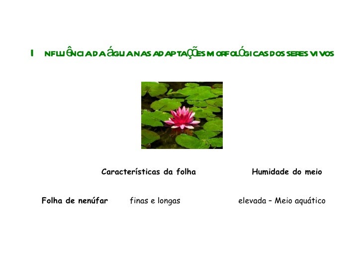 87. 87. Influência da água nas adaptações morfológicas dos seres vivos Características da folha Humidade do meio Folha de nenúfar finas e longas elevada – Meio aquático