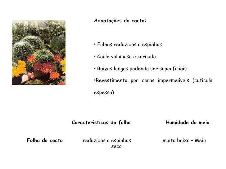 88. 88. Características da folha Humidade do meio Folha do cacto reduzidas a espinhos muito baixa – Meio seco <ul><li>Adaptações do cacto: </li></ul><ul><li>Folhas reduzidas a espinhos </li></ul><ul><li>Caule volumoso e carnudo </li></ul><ul><li>Raízes longas podendo ser superficiais </li></ul><ul><li>Revestimento por ceras impermeáveis (cutícula espessa) </li></ul>