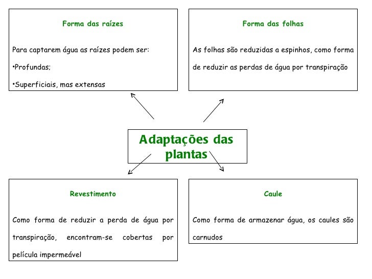 89. 89. Adaptações das plantas <ul><li>Forma das raízes </li></ul><ul><li>Para captarem água as raízes podem ser: </li></ul><ul><li>Profundas; </li></ul><ul><li>Superficiais, mas extensas </li></ul>Forma das folhas As folhas são reduzidas a espinhos, como forma de reduzir as perdas de água por transpiração Revestimento Como forma de reduzir a perda de água por transpiração, encontram-se cobertas por película impermeável Caule Como forma de armazenar água, os caules são carnudos