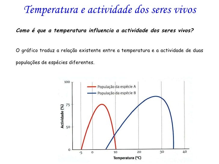 9. 9. Temperatura e actividade dos seres vivos <ul><ul><ul><ul><ul><li>Como é que a temperatura influencia a actividade dos seres vivos? </li></ul></ul></ul></ul></ul><ul><ul><ul><ul><ul><li>O gráfico traduz a relação existente entre a temperatura e a actividade de duas populações de espécies diferentes. </li></ul></ul></ul></ul></ul>