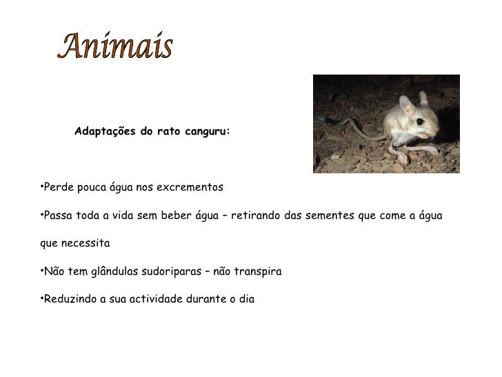 90. 90. <ul><li>Adaptações do rato canguru: </li></ul><ul><li>Perde pouca água nos excrementos </li></ul><ul><li>Passa toda a vida sem beber água – retirando das sementes que come a água que necessita </li></ul><ul><li>Não tem glândulas sudoriparas – não transpira </li></ul><ul><li>Reduzindo a sua actividade durante o dia </li></ul>Animais
