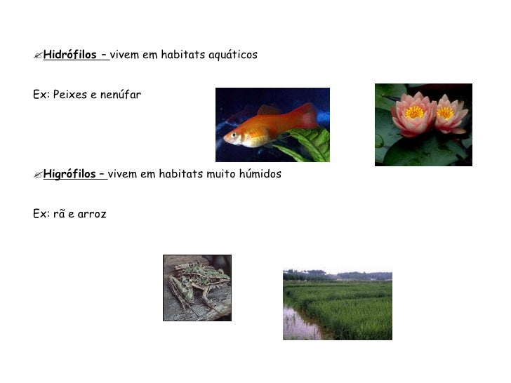 93. 93.  Hidrófilos – vivem em habitats aquáticos Ex: Peixes e nenúfar  Higrófilos – vivem em habitats muito húmidos Ex: rã e arroz