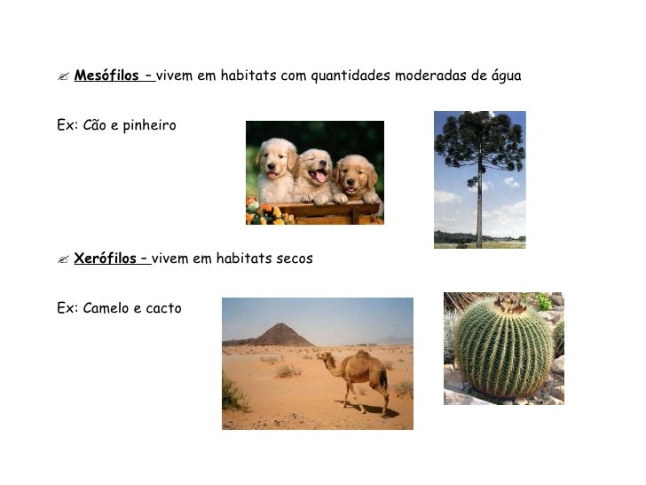 94. 94.  Mesófilos – vivem em habitats com quantidades moderadas de água Ex: Cão e pinheiro  Xerófilos – vivem em habitats secos Ex: Camelo e cacto