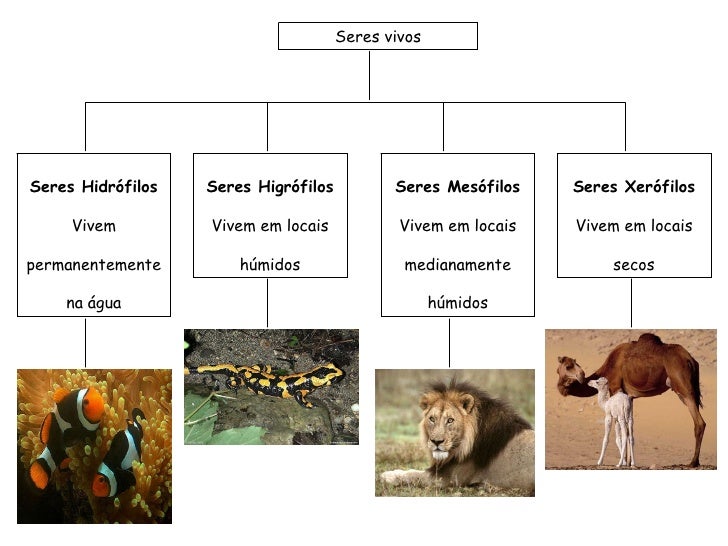 95. 95. Seres vivos Seres Hidrófilos Vivem permanentemente na água Seres Higrófilos Vivem em locais húmidos Seres Mesófilos Vivem em locais medianamente húmidos Seres Xerófilos Vivem em locais secos