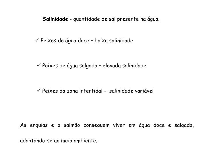 97. 97. Salinidade - quantidade de sal presente na água.  Peixes de água doce – baixa salinidade  Peixes de água salgada – elevada salinidade  Peixes da zona intertidal - salinidade variável As enguias e o salmão conseguem viver em água doce e salgada, adaptando-se ao meio ambiente.